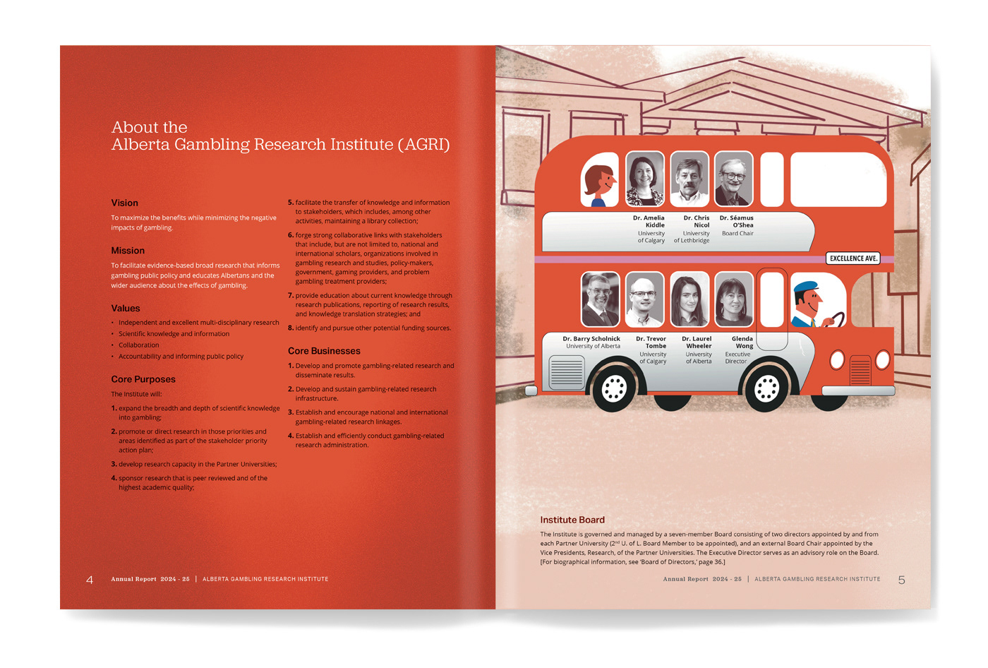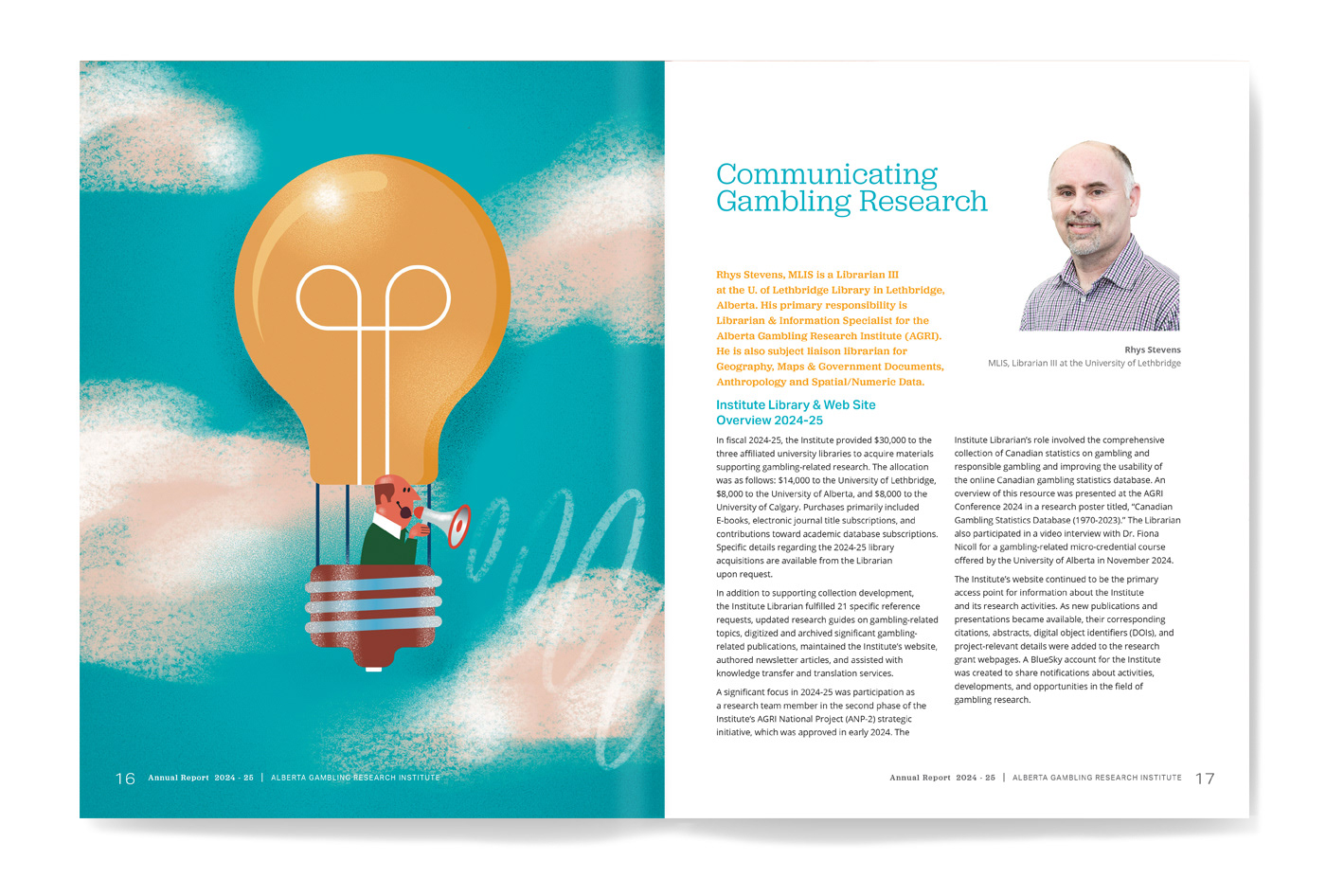 North Design was proud to design and illustrate this milestone annual report for the Institute. Created to celebrate AGRI’s 25th anniversary, the report reflects a shared commitment to the pursuit of excellence and to advancing research that informs public policy. The Alberta Gambling Research Institute brings together the University of Alberta, the University of Calgary, and the University of Lethbridge to support gambling research across Alberta and internationally through its annual conferences.