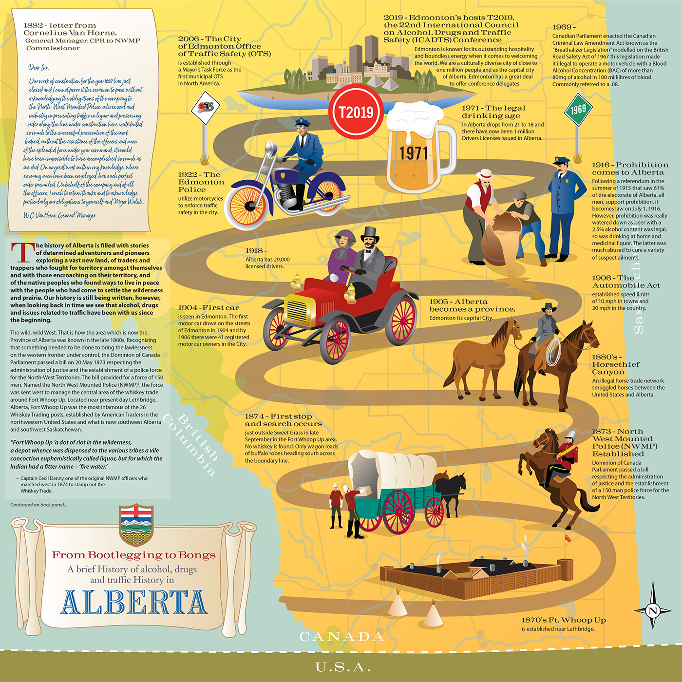 In 2019, the City of Edmonton's Traffic Safety Division hosted the 22nd International Conference on Alcohol, Drugs and Traffic Safety (ICADTS). We were asked to produce a map give-away which highlighted a brief history of alcohol, drugs and traffic in Alberta.